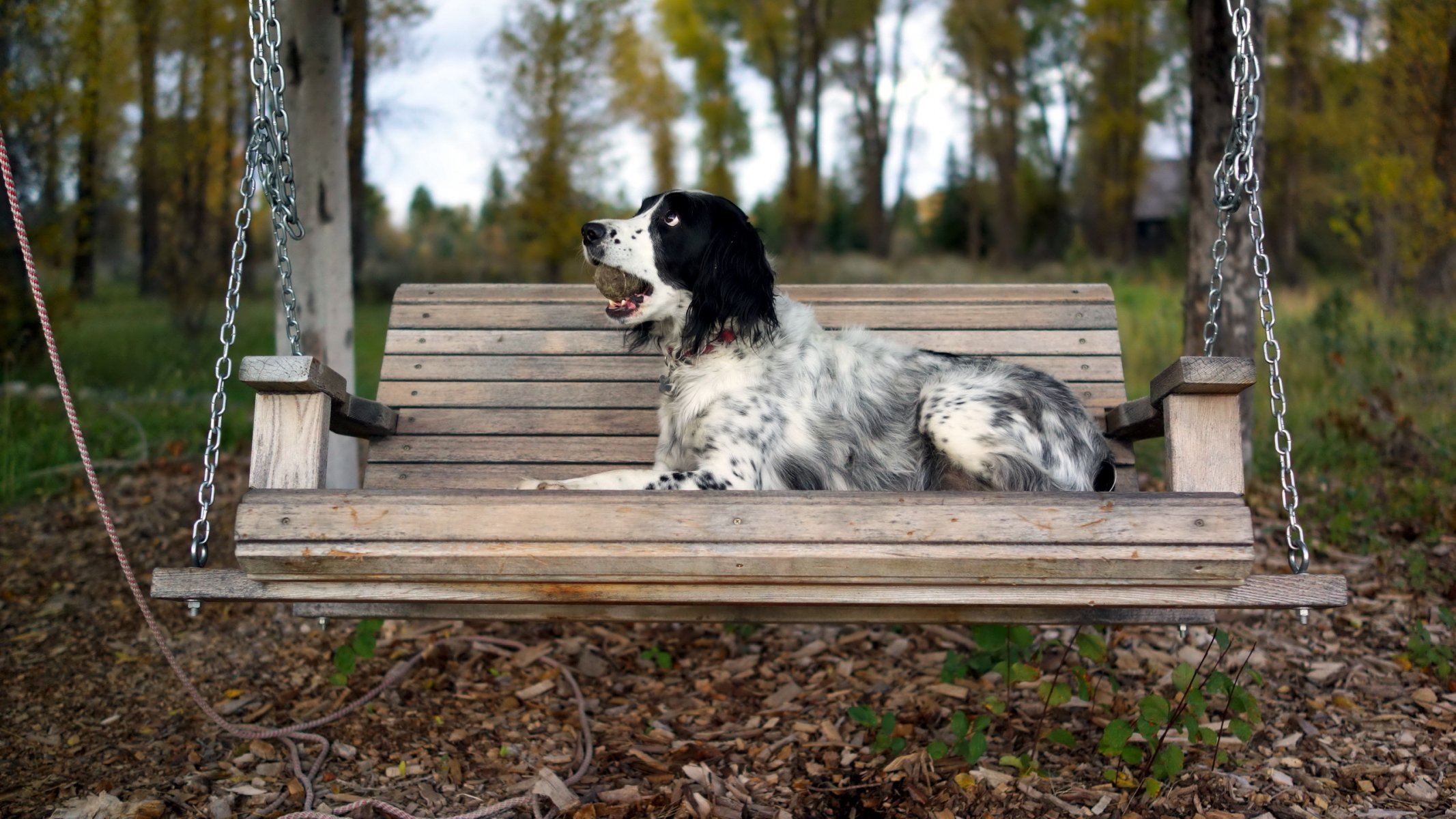 Ein Hund liegt auf einer Schaukel mit einem Spielzeug in den Zähnen