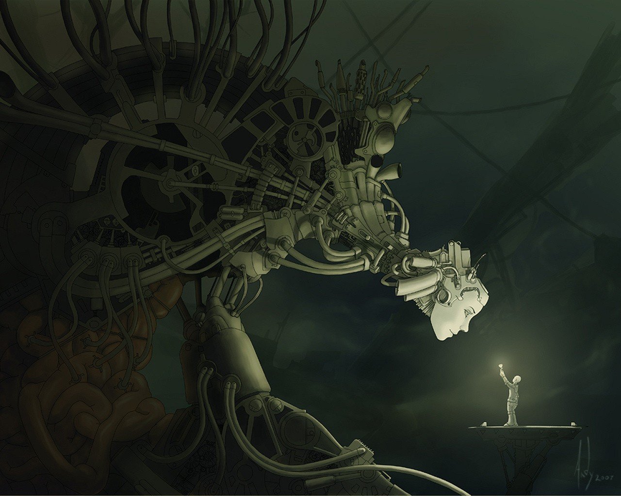 Das gesicht des roboters und der mann mit dem lichtDas Gesicht des Roboters und der Mann mit dem Licht