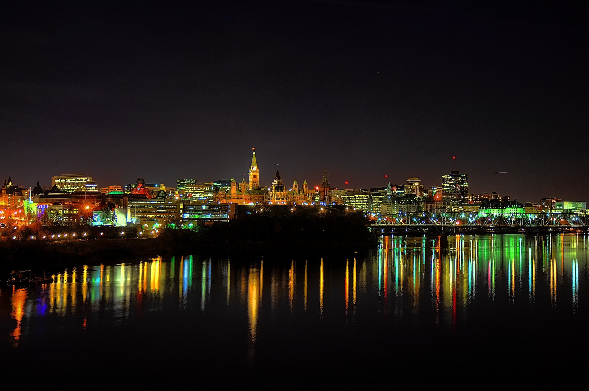 Kanadas nachtstadt spiegelt sich im wasser wider