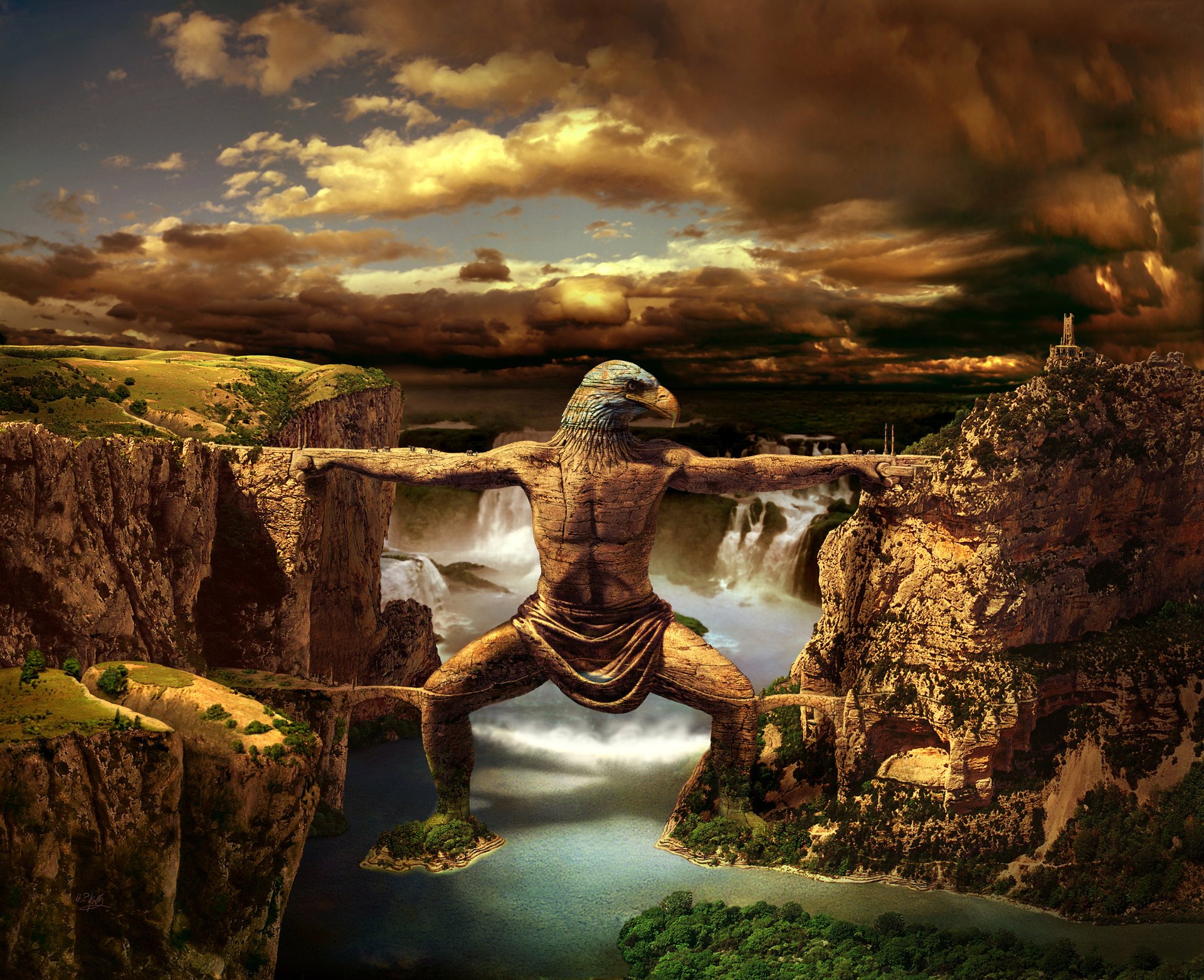 Ein Mann mit einem Adlerkopf aus Stein
