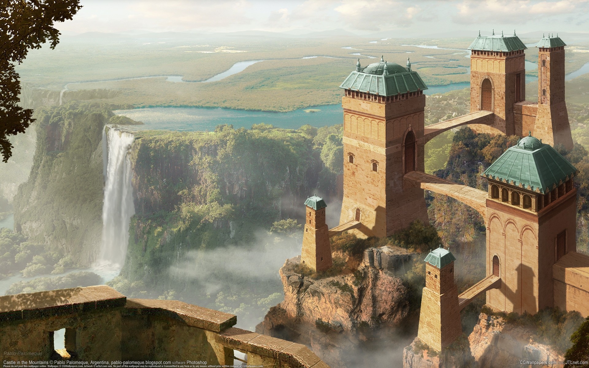 Ein altes schloss vor dem hintergrund eines steilen wasserfallsEin altes Schloss vor dem Hintergrund eines steilen Wasserfalls