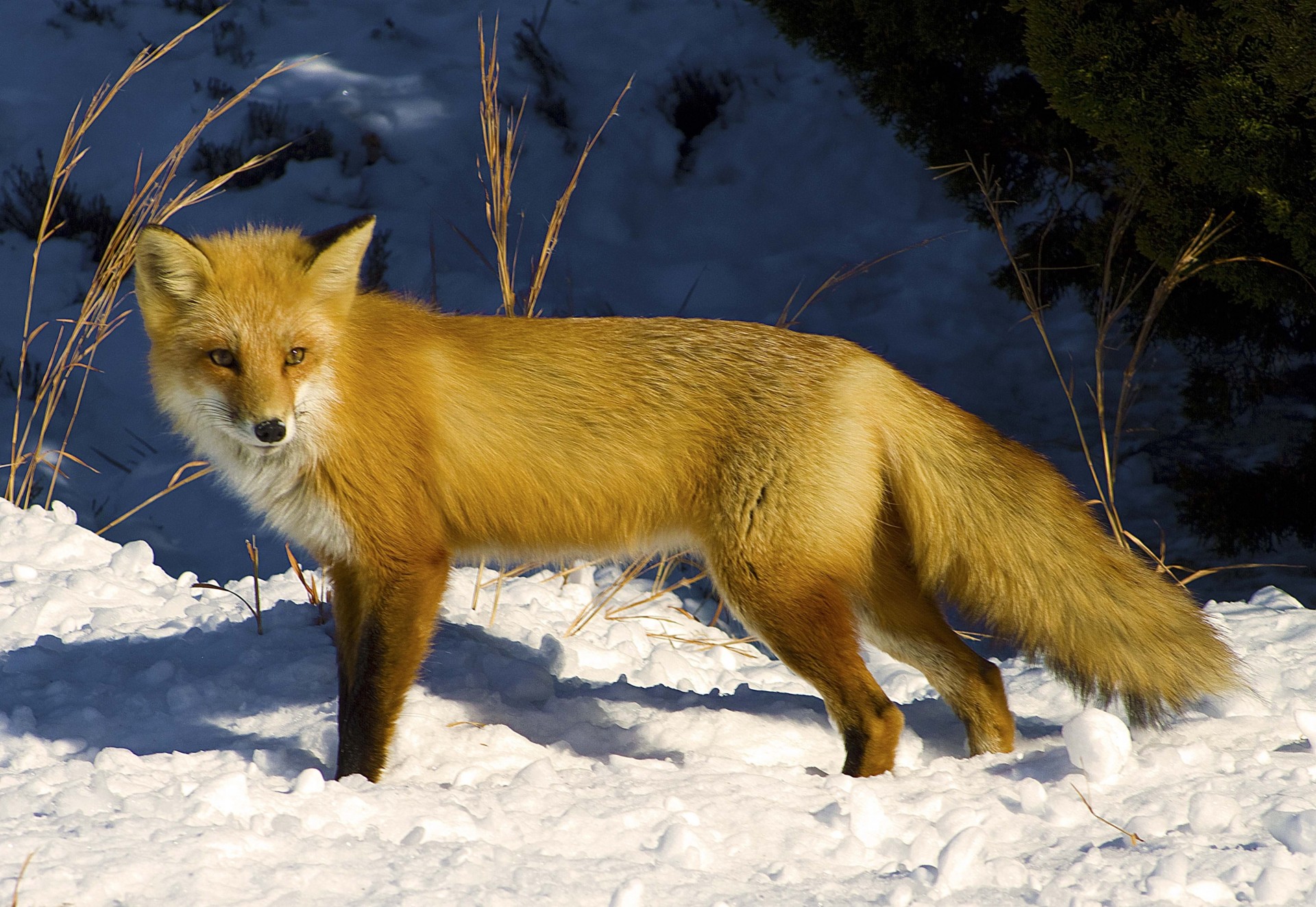 Rothaarige Füchsin auf dem Schnee, um sich zu drängen