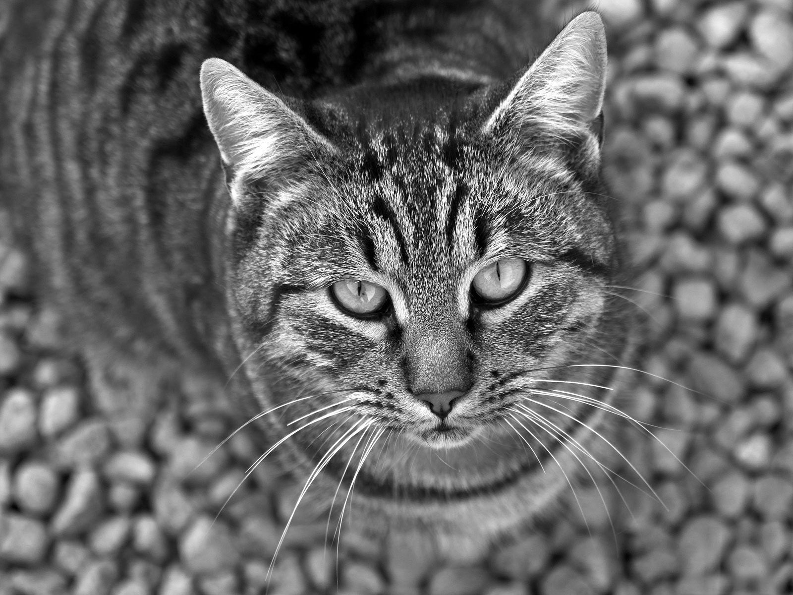Die Katze wirft einen genaueren Blick, ein Schwarz-Weiß-Foto