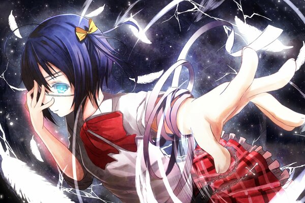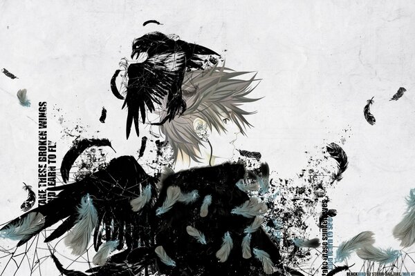 Schwarz-Weiß-Anime-Bild mit Federn
