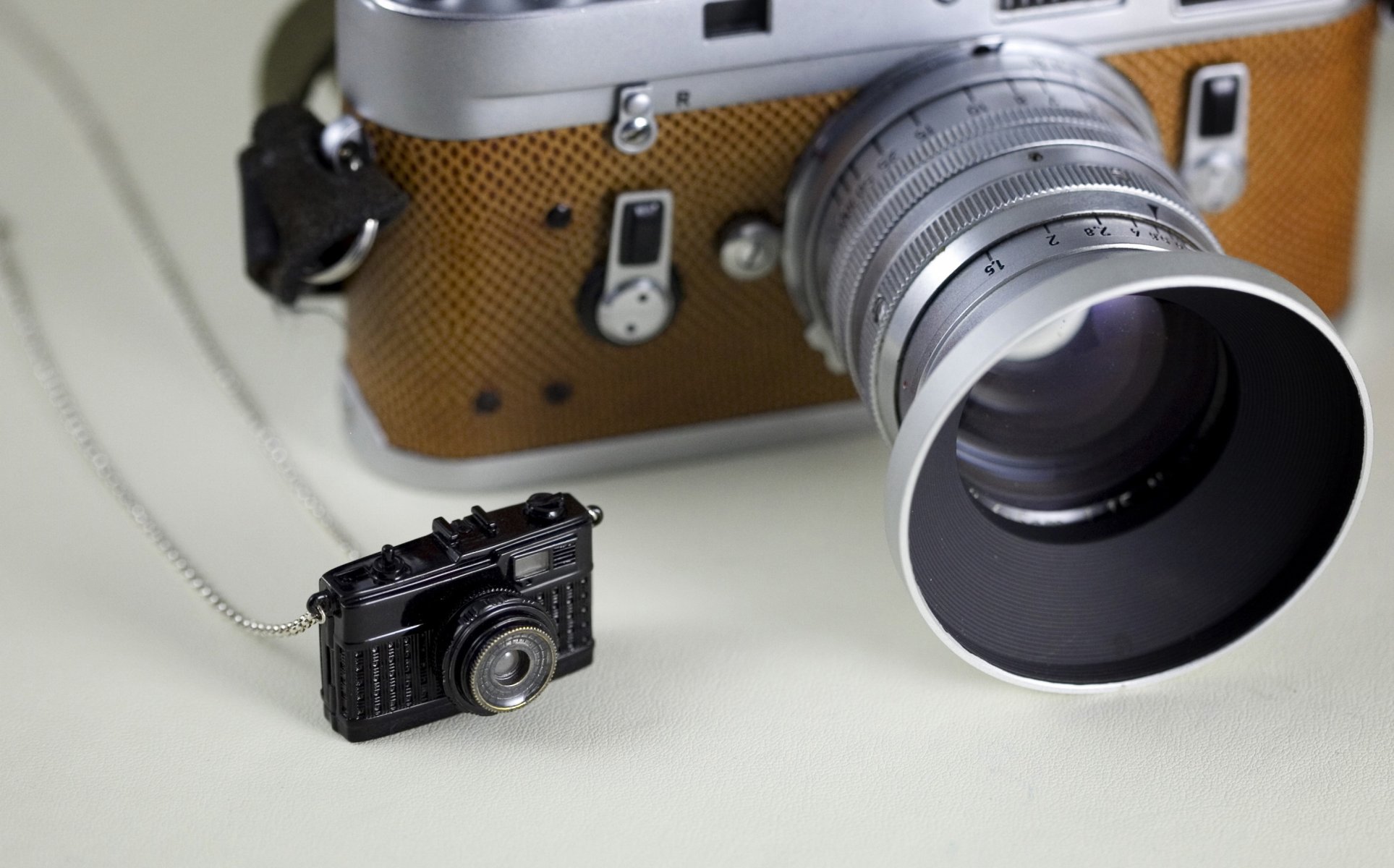 Es gibt eine Kamera und eine kleine schwarze Aufhängung in Form einer Kamera in der Nähe