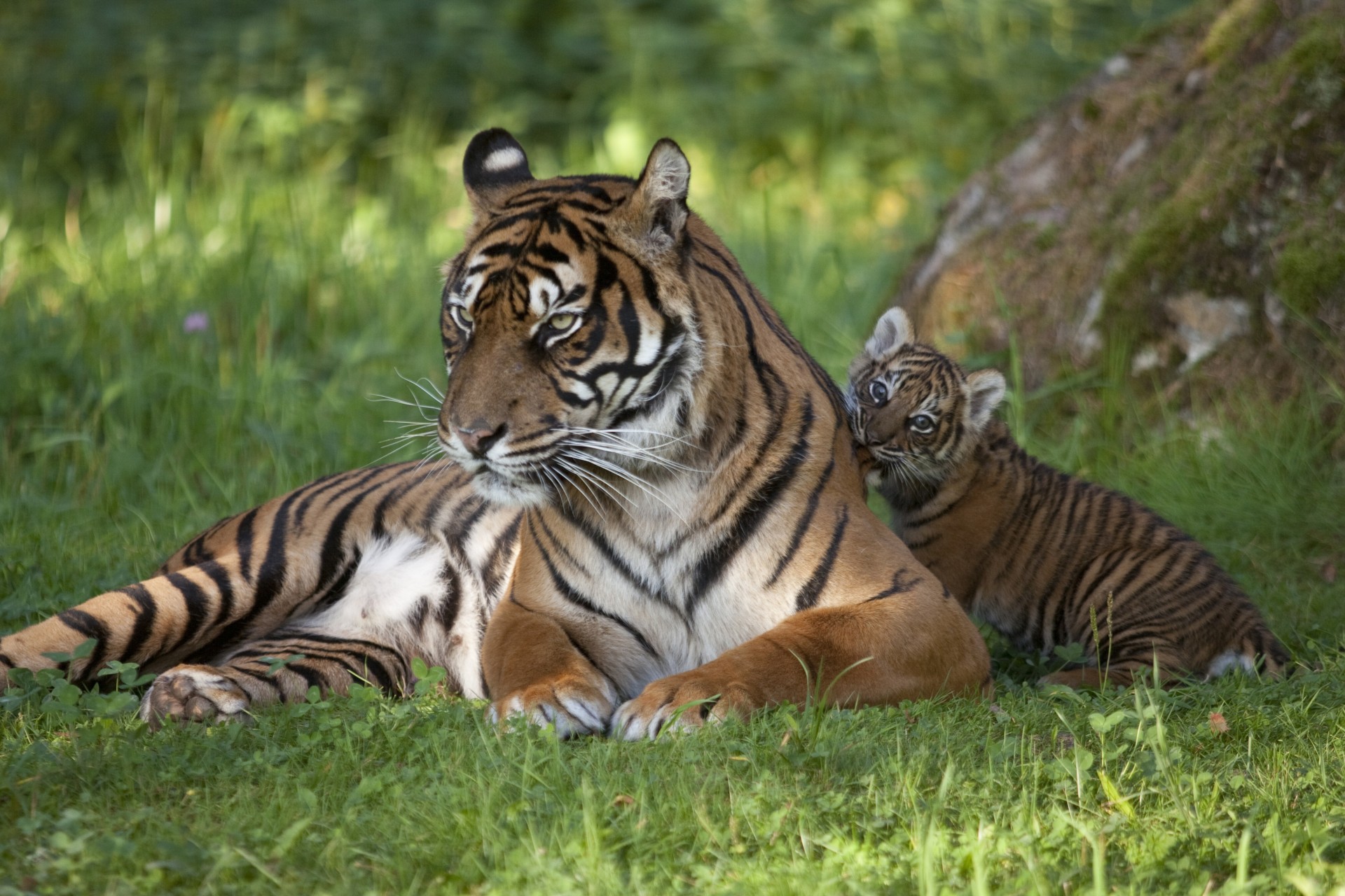 Eine tigerin und ein kleinkind ruhen sich im schatten eines baumes ausEine Tigerin und ein Kleinkind ruhen sich im Schatten eines Baumes aus