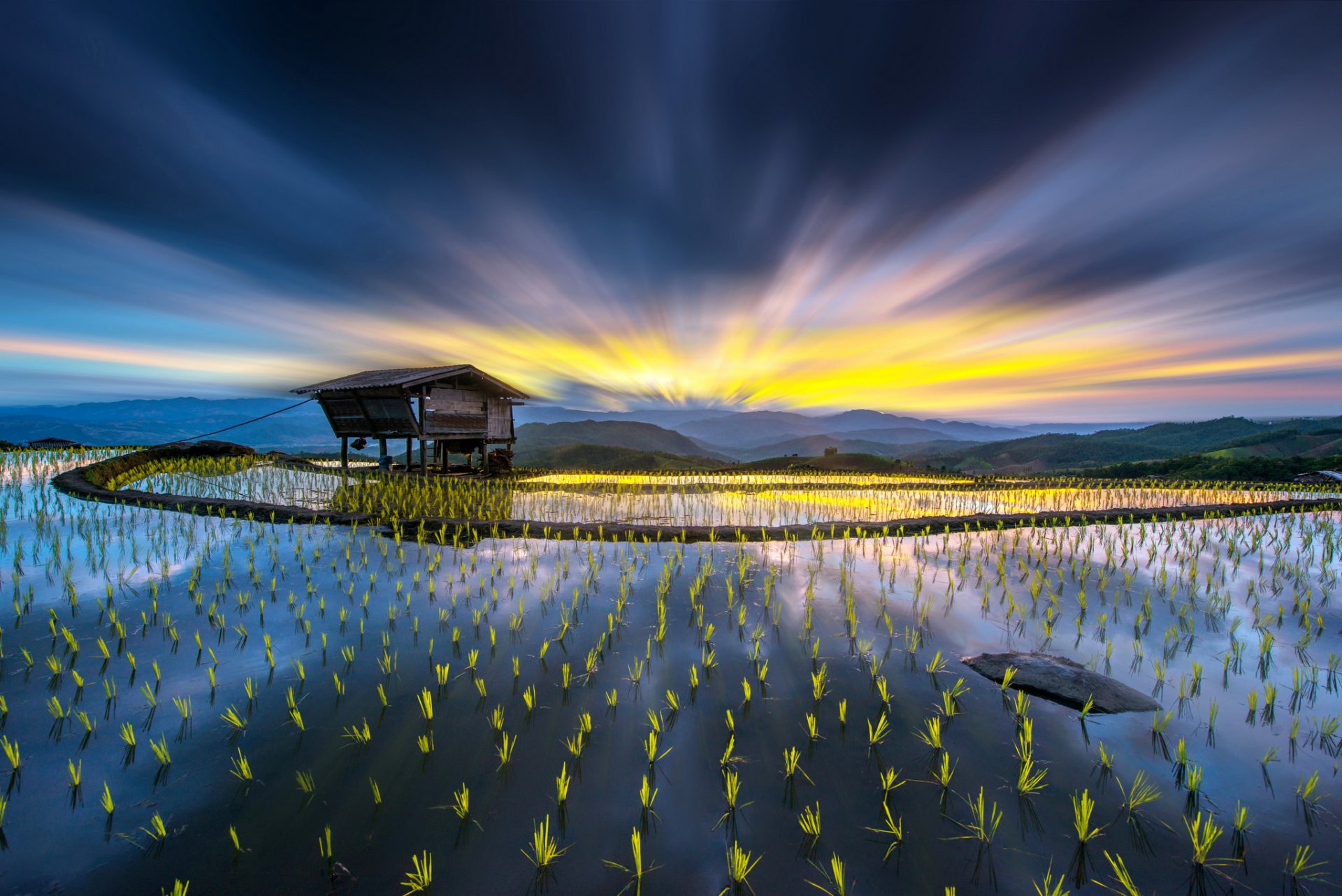 Haus und feld vor dem hintergrund des nachthimmels und des hellen mondesHaus und Feld vor dem Hintergrund des Nachthimmels und des hellen Mondes