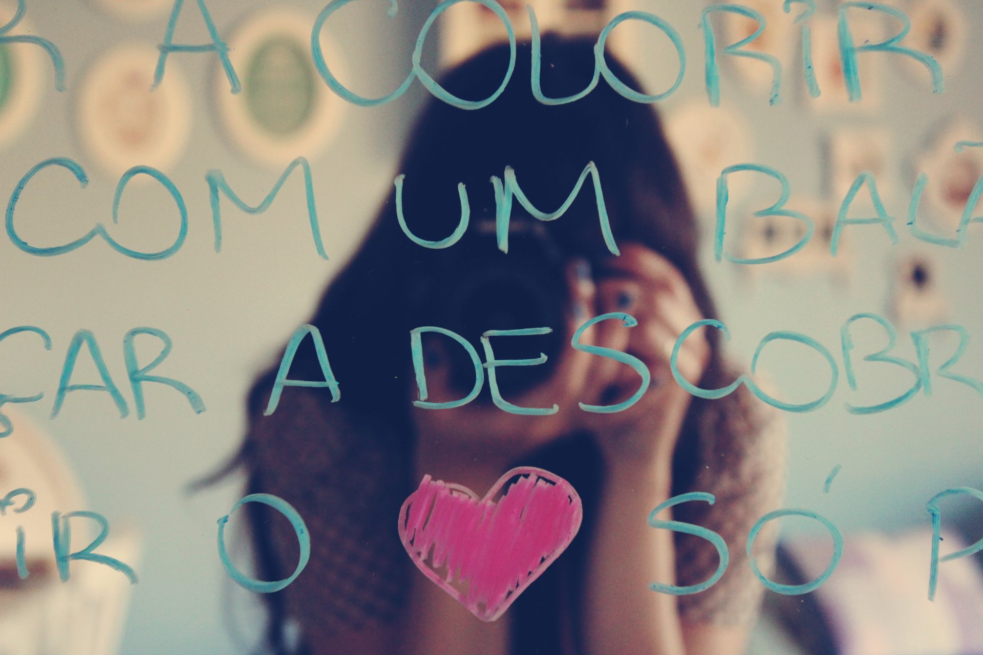 Brünette mädchen fotografiert sich im spiegel mit einer liebeserklärungBrünette Mädchen fotografiert sich im Spiegel mit einer Liebeserklärung