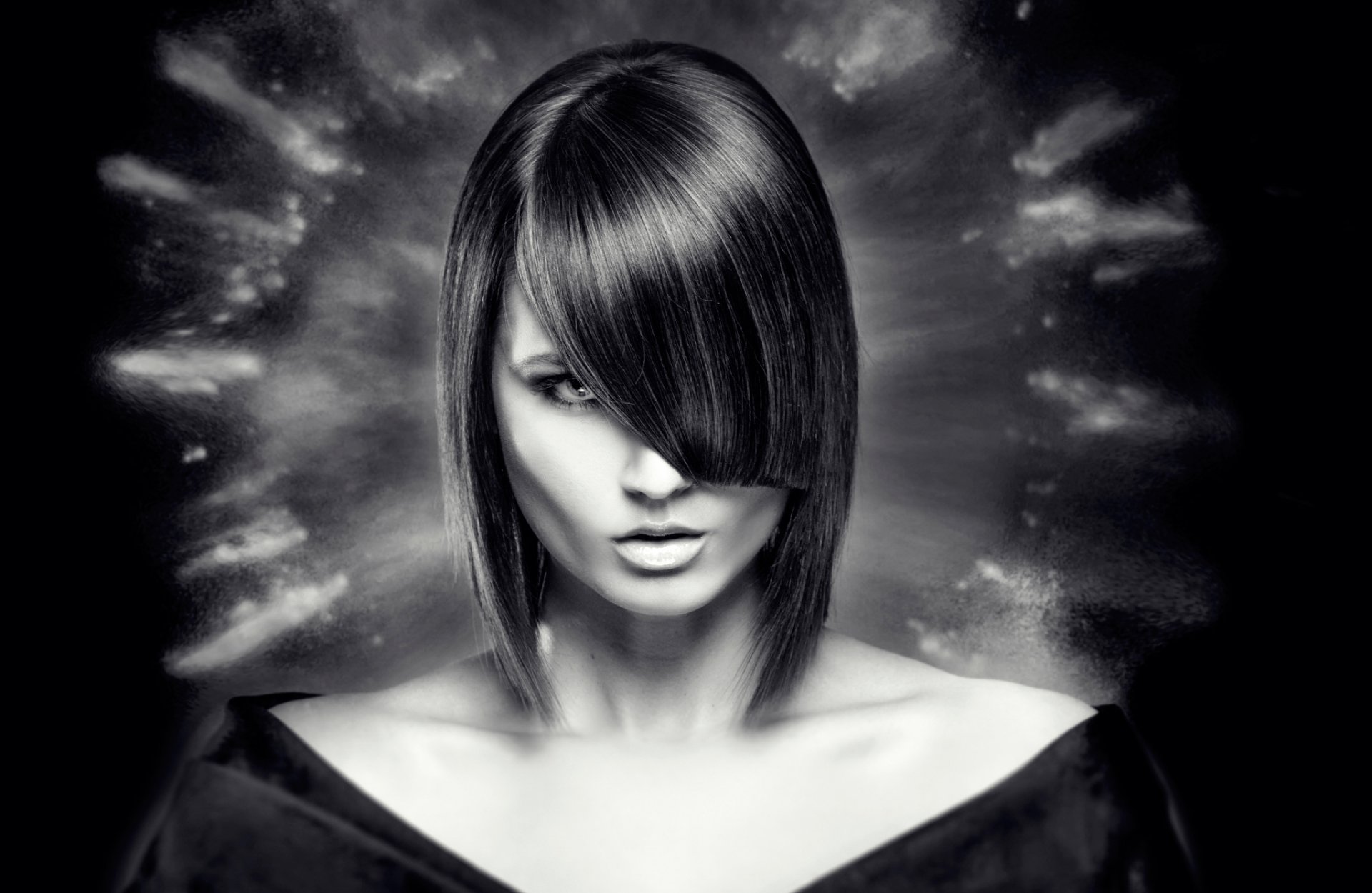 Ein schwarz-weiß-bild eines mädchens mit einem quadrat und einem sehr langen ponyEin Schwarz-Weiß-Bild eines Mädchens mit einem Quadrat und einem sehr langen Pony