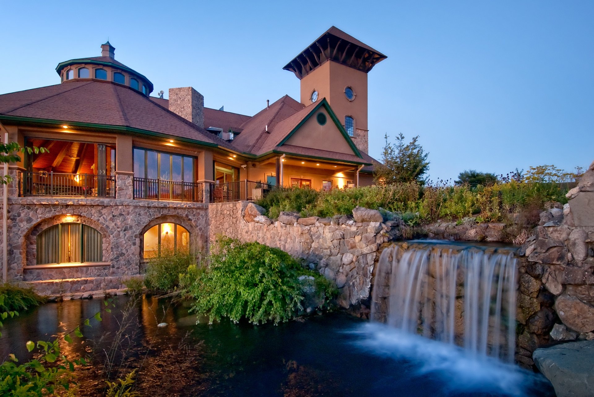 Blauer See gelbe Blätter an Bäumen und Wasserfall