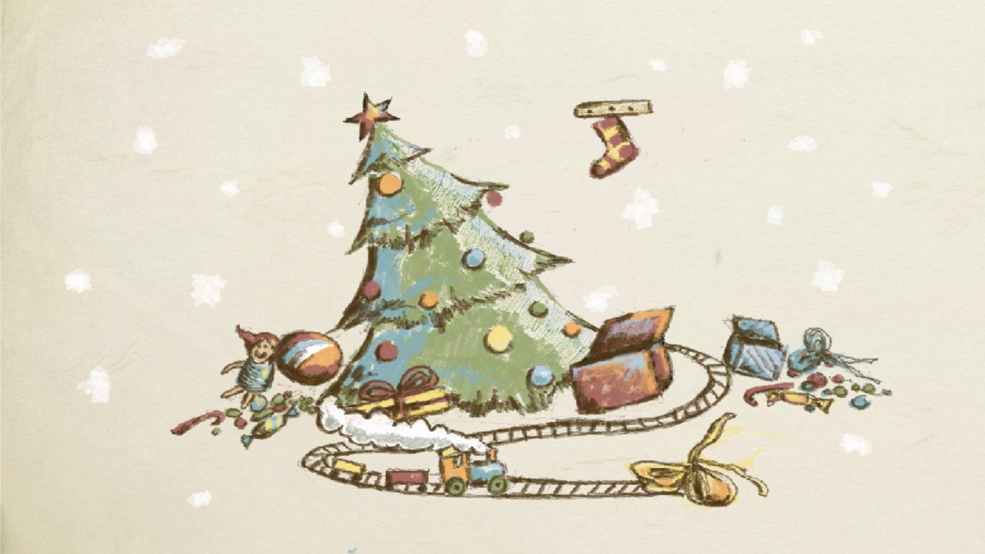 Festliche Zeichnung mit Weihnachtsbaum und Geschenken