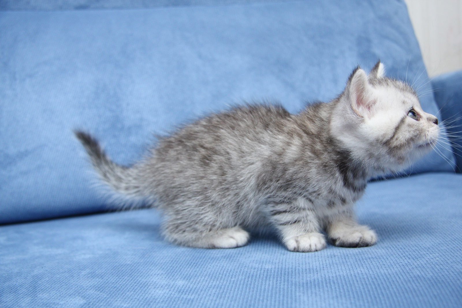 Eine kleine graue Katze sitzt auf einem blauen Sofa