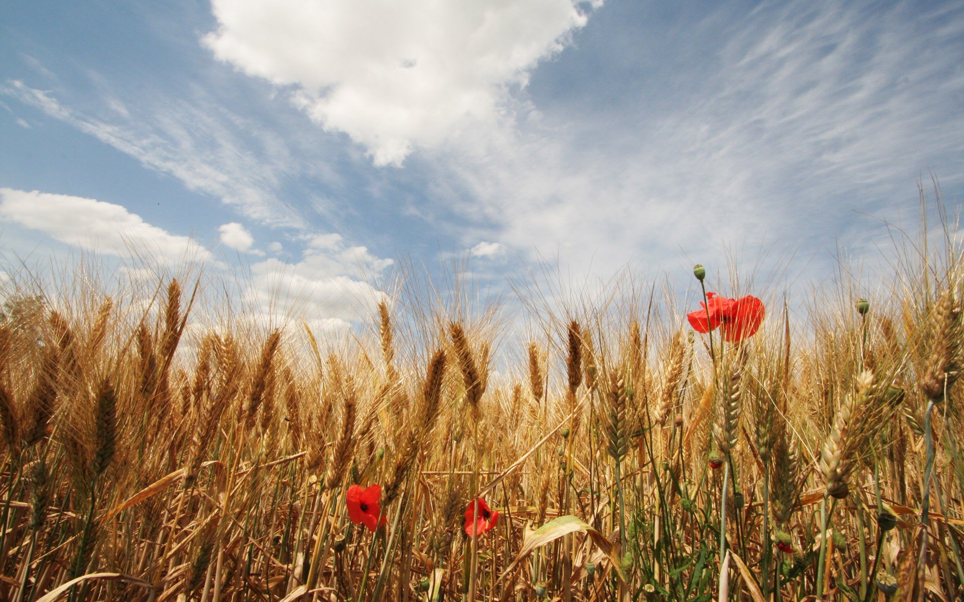 Mohn und Weizen, ein Aufstand von Sommerfarben am Himmelshintergrund