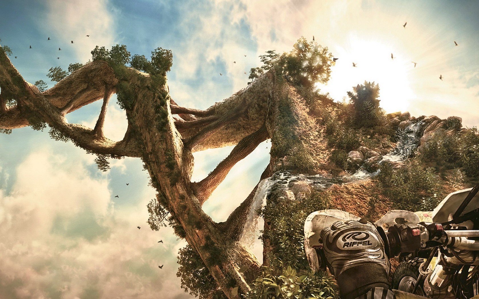 Eine Spirale aus Bäumen und Erde und einem Motorrad