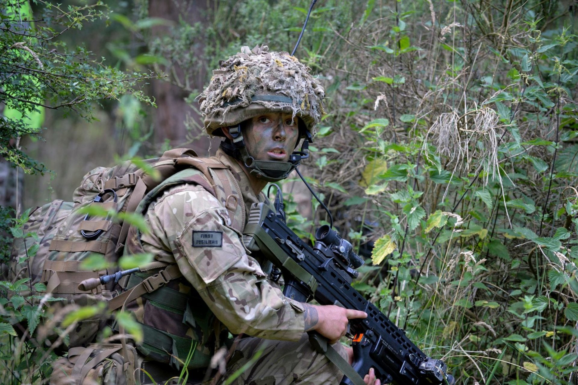 Ein Soldat mit einer Waffe schleicht sich durch einen wilden Wald