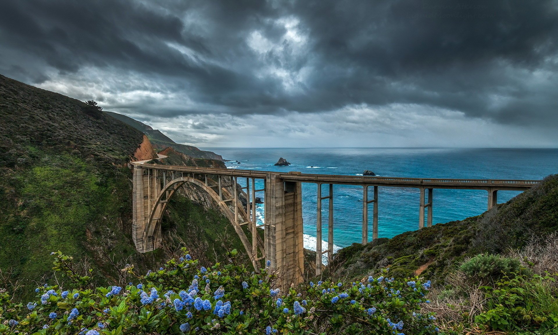 Schöne Landschaft mit Brücke zum Meer und Wolken