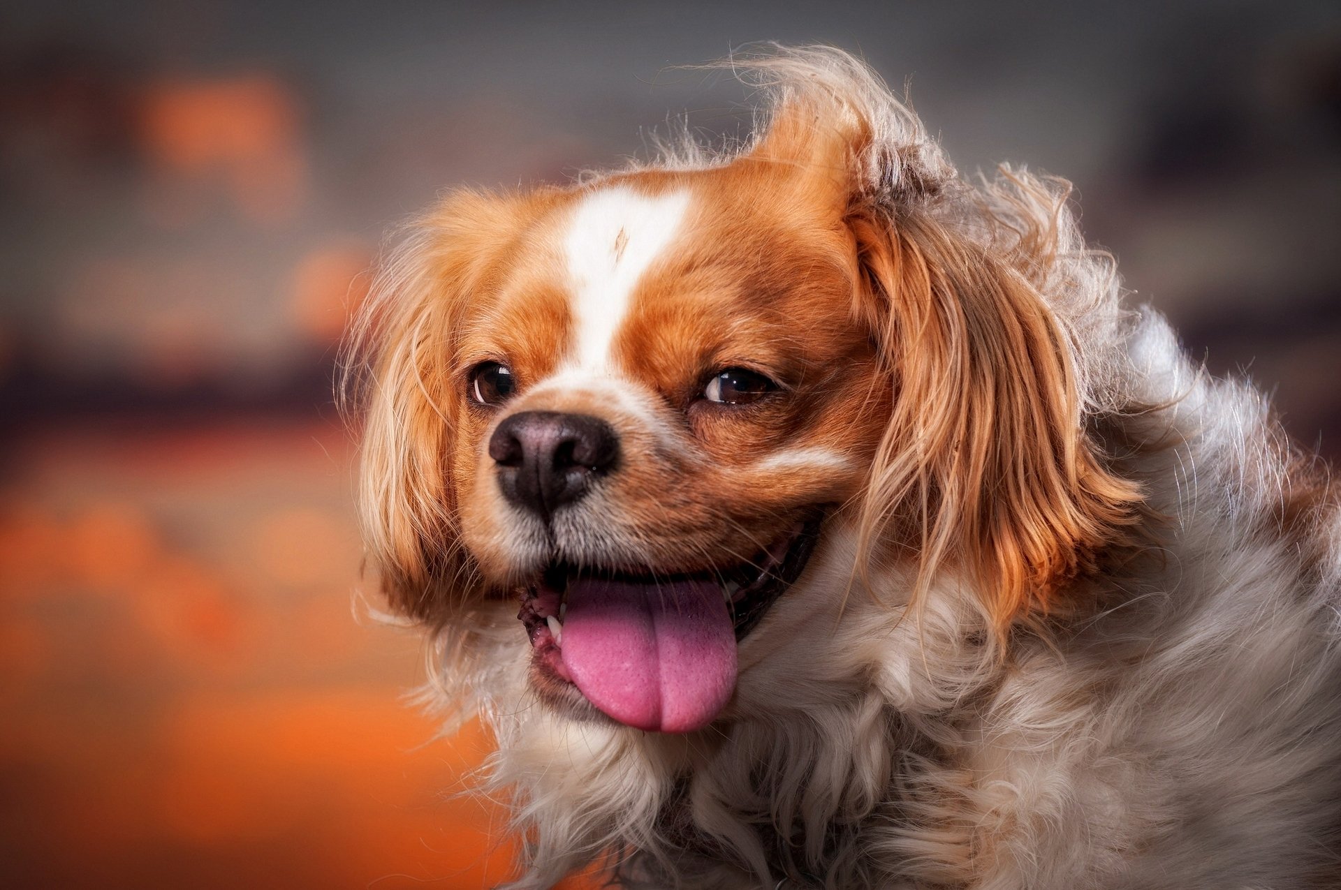 Brauner Hund mit einem Kopftuch um den Hals und einer ausgestreckten Zunge vor einem Hintergrund der Natur