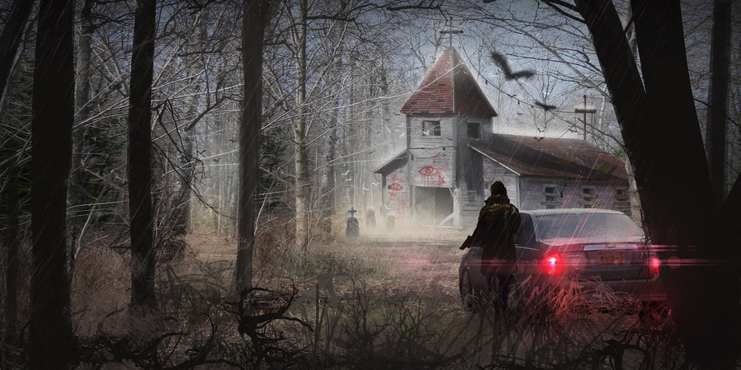 Gruselige Kunst mit einer verlassenen Kirche und einem bewaffneten Mädchen mit dem Auto