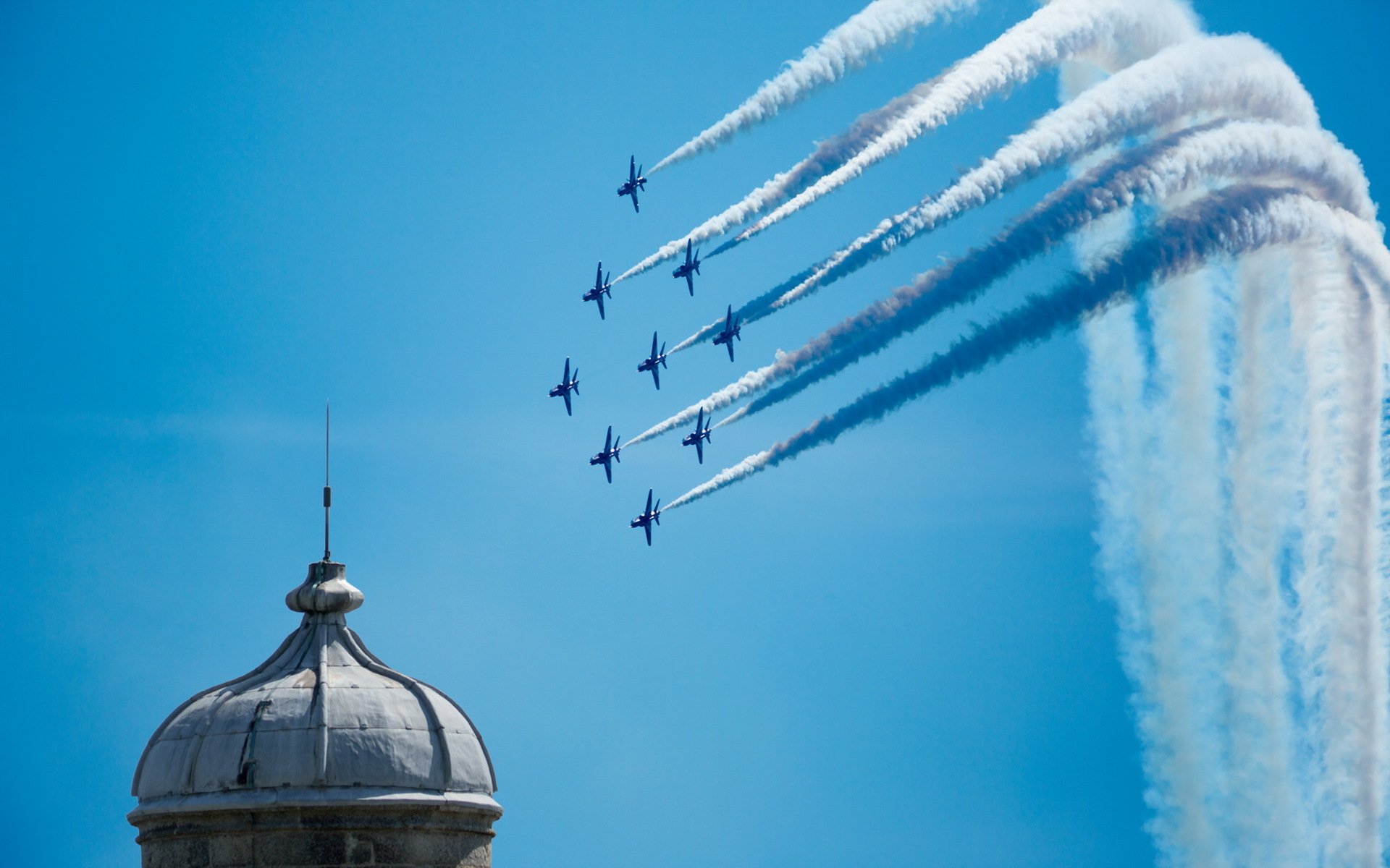 Die show am himmel die flugzeuge gehen mit einem keil davon, die streifen zu verlassenDie Show am Himmel die Flugzeuge gehen mit einem Keil davon, die Streifen zu verlassen