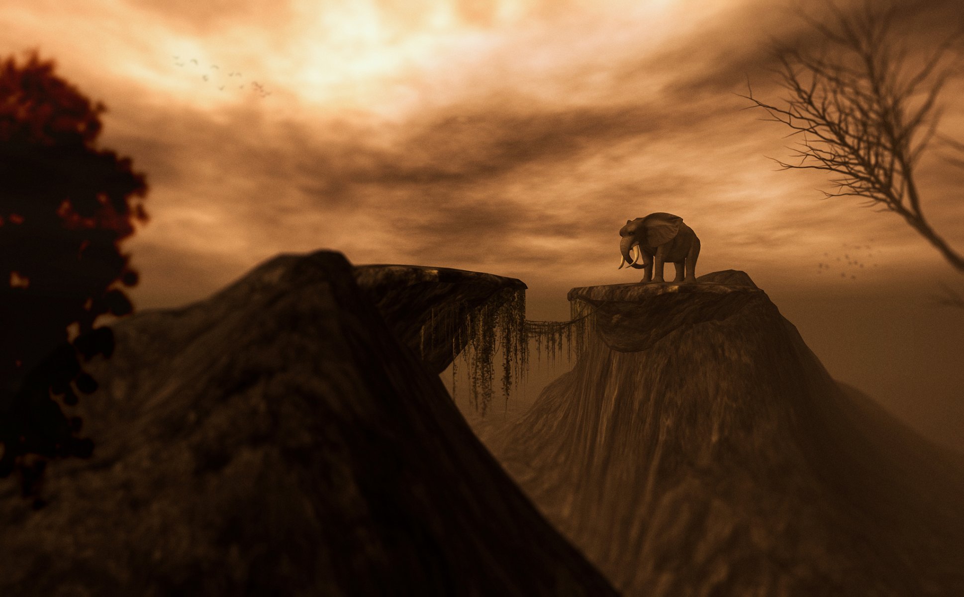 Elefant in der Nähe einer Klippe vor dem Hintergrund eines dunklen Himmels