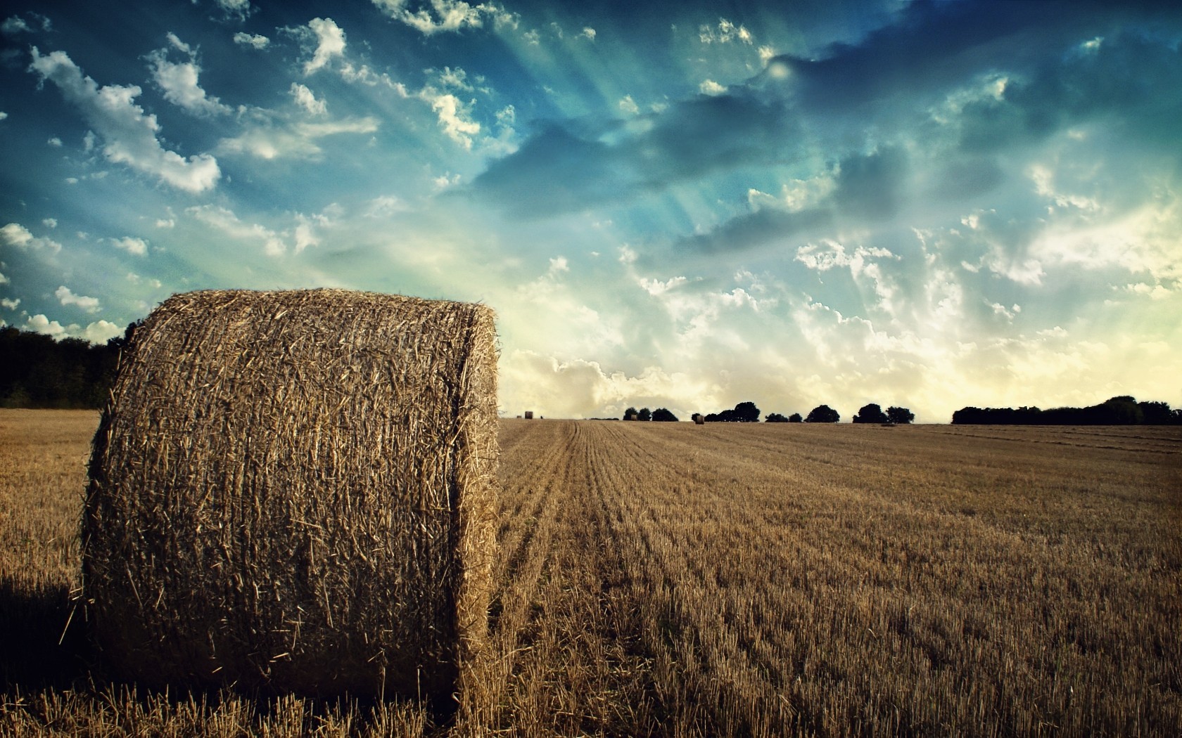 Strohballen nach der Ernte von Getreide bei Sonnenuntergang. Die Strada ist in vollem Gange