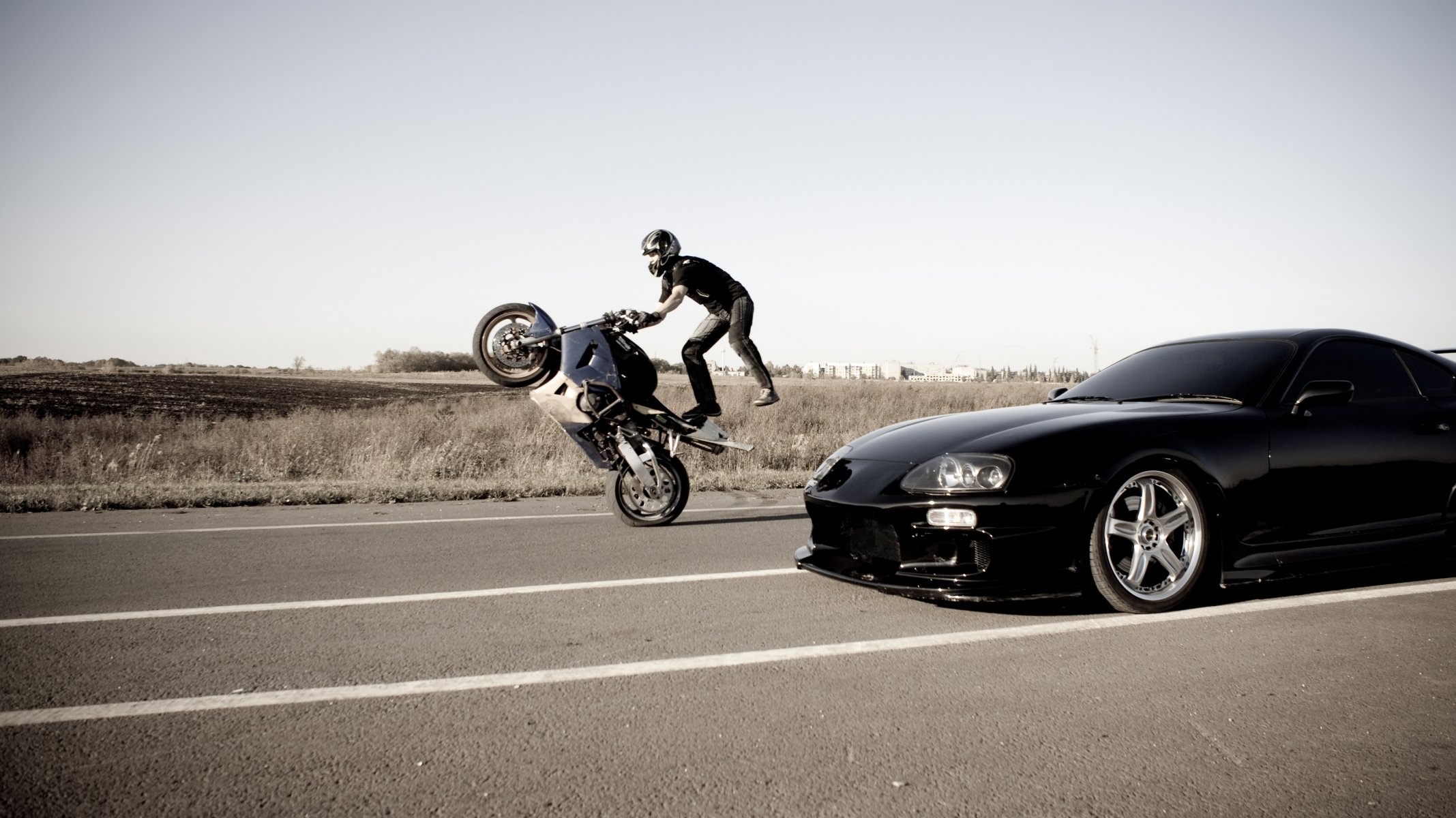 TOYOTA UND DER STUNTMAN AUF EINEM MOTORRAD REITEN
