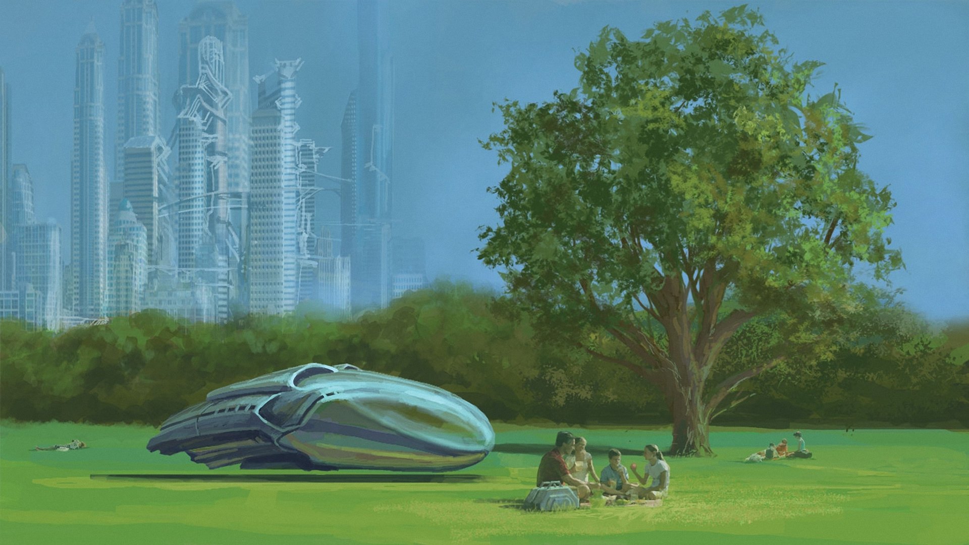 Eine ferne utopie, in der es sowohl parks als auch düsenflugzeuge gibtEine ferne Utopie, in der es sowohl Parks als auch Düsenflugzeuge gibt