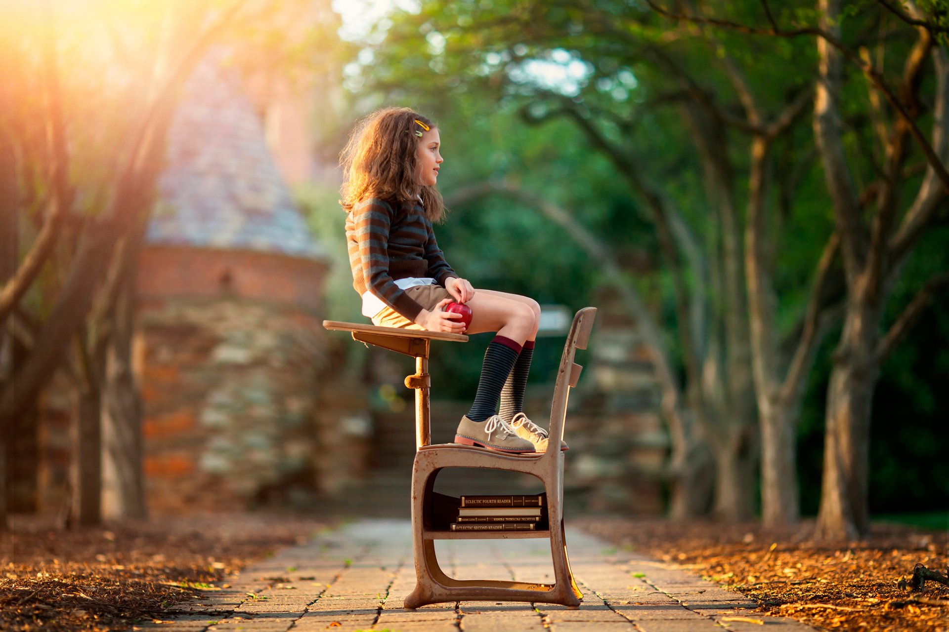 Mädchen sitzt auf einem schreibtisch auf der straße