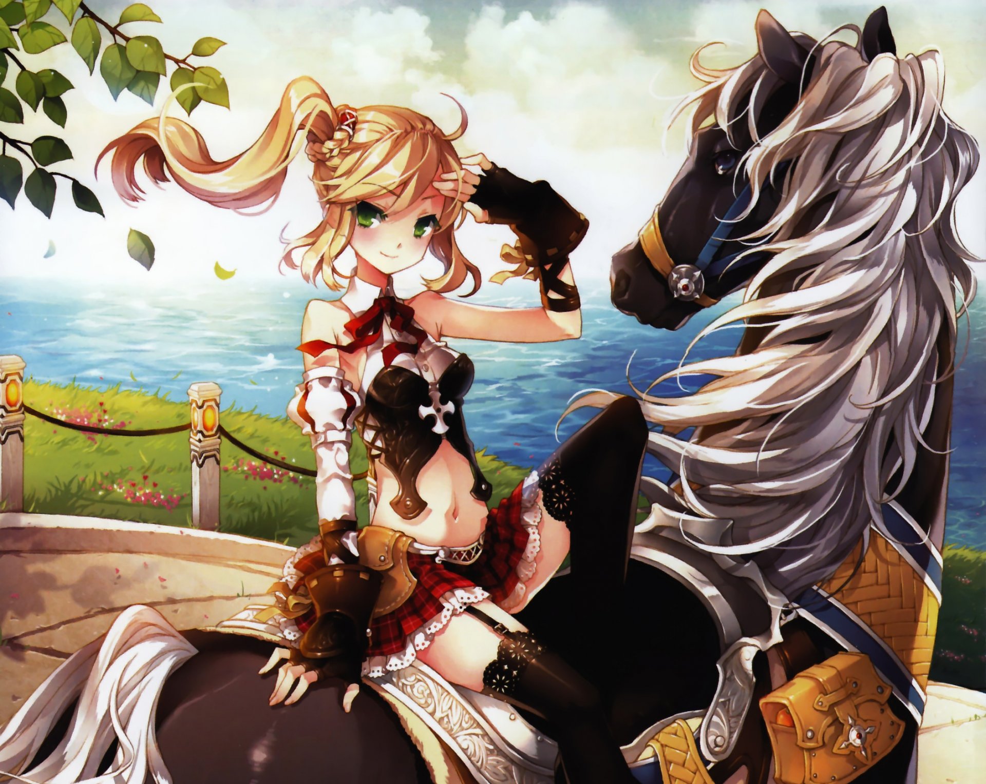 Blonde anime auf einem schwarzen Pferd