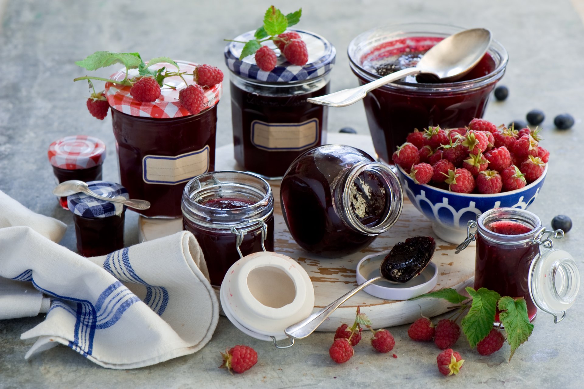 Auf dem Tisch liegen Marmeladengläser und ein tiefer Teller mit Himbeerbeeren