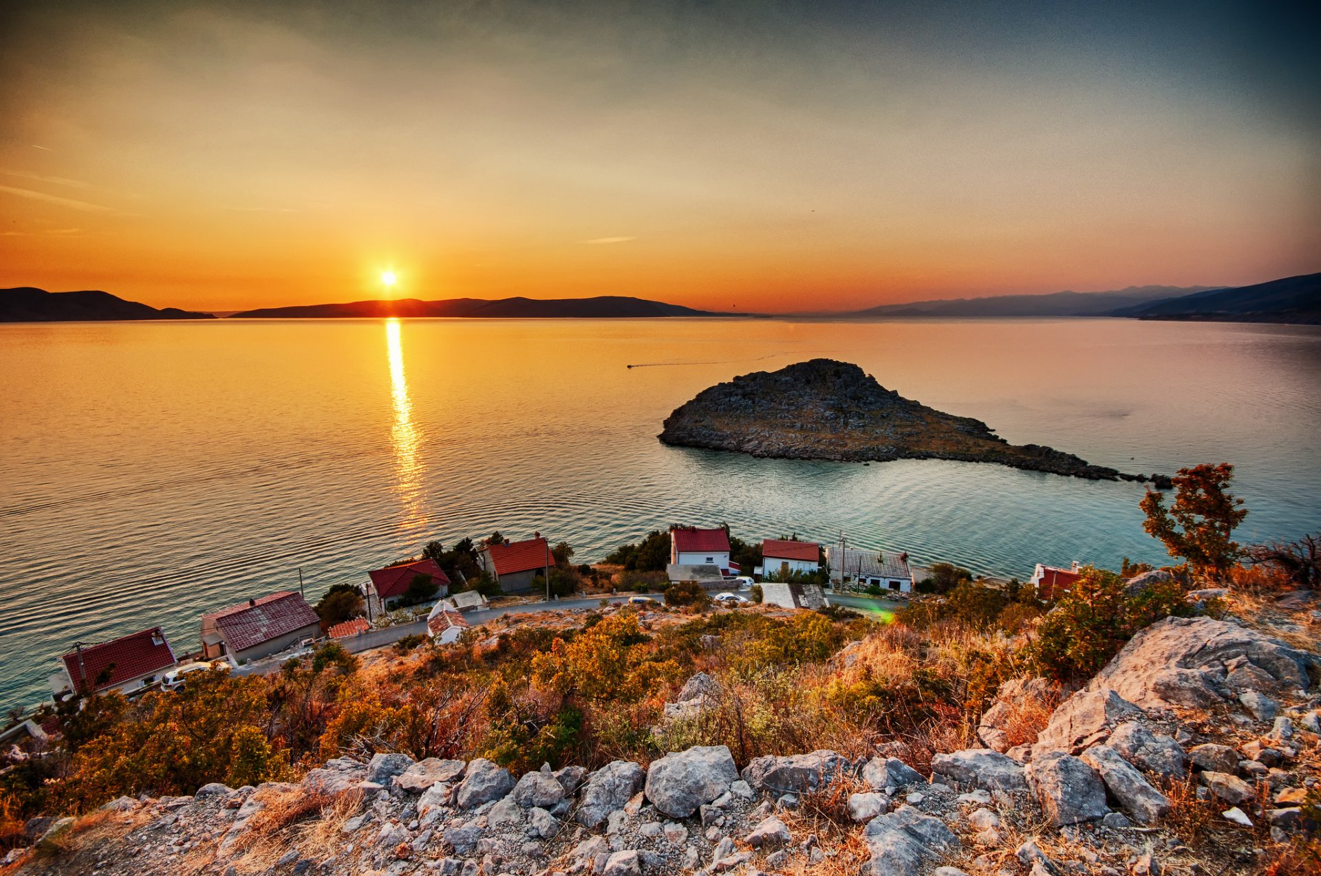 Hügel, Felsen, Bäume in einem kleinen Dorf in der Sonne