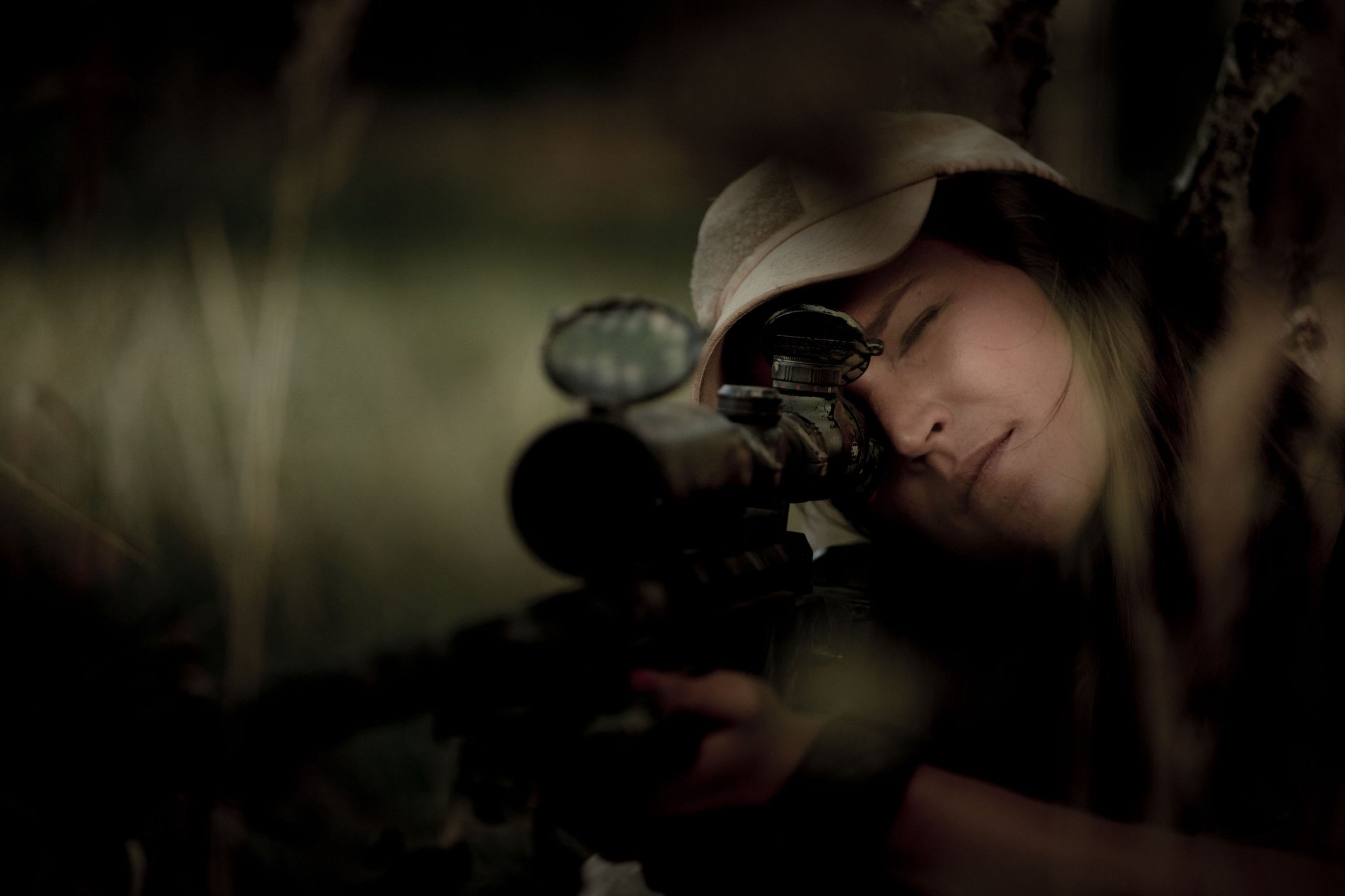 Ein scharfschütze mit einem gewehr in der hand hat sich ins visier genommenEin Scharfschütze mit einem Gewehr in der Hand hat sich ins Visier genommen