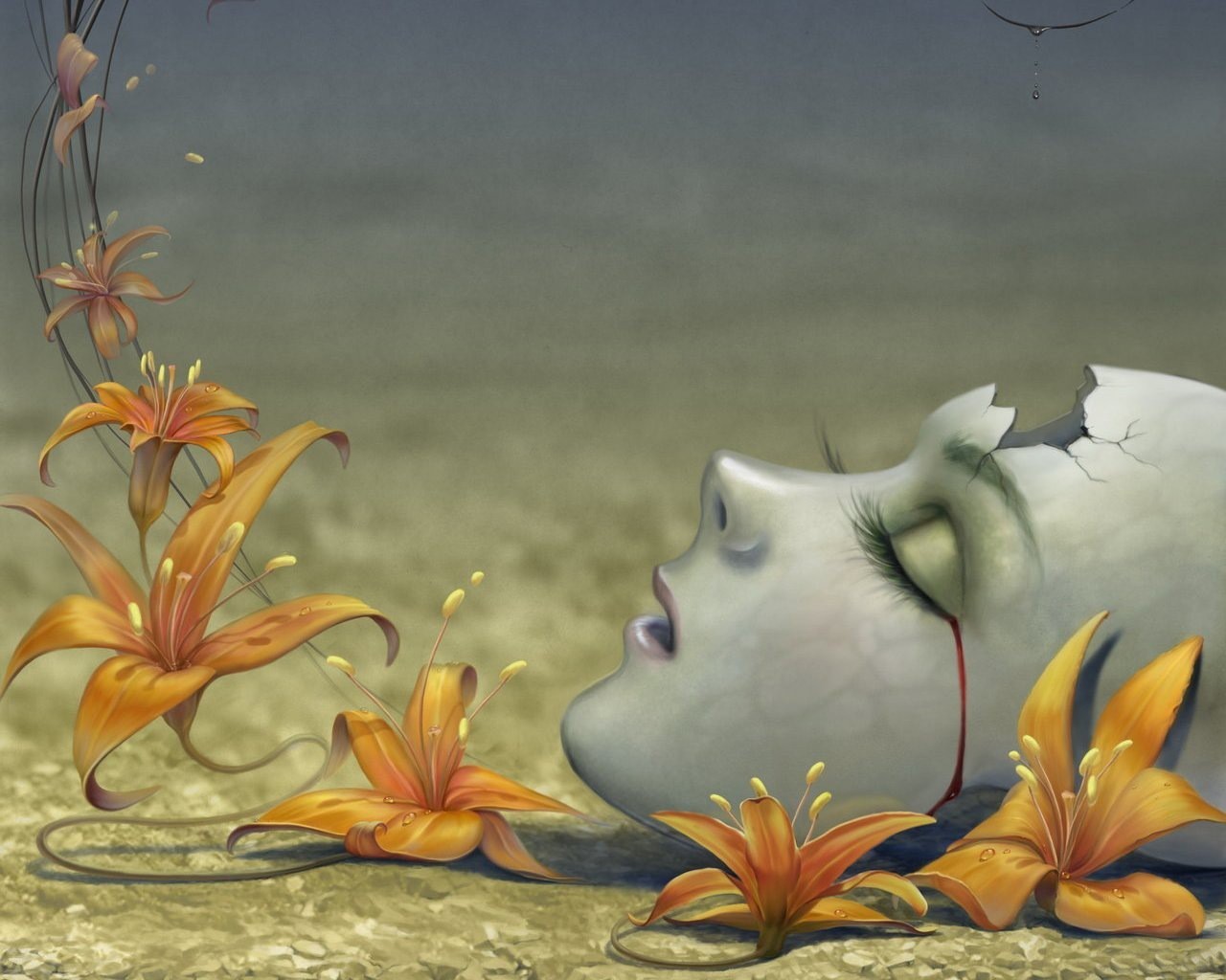 Eine Frau mit geschlossenen Augen, roten Tränen mit langen, flatternden Haaren in Federn in düsteren Farben