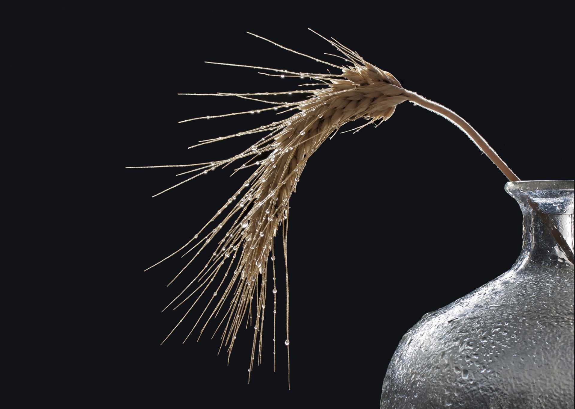 Vase mit grün in einem raum in der nähe eines weißen vorhangsVase mit Grün in einem Raum in der Nähe eines weißen Vorhangs