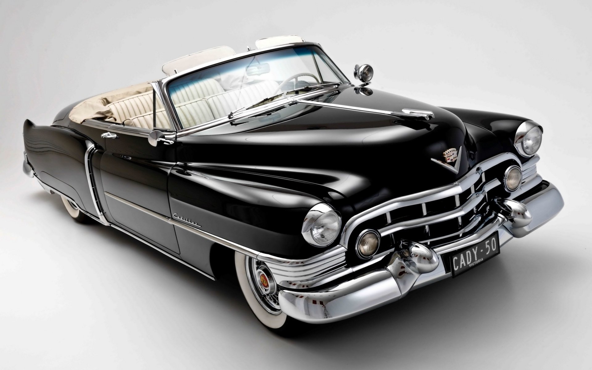 Auf weißem Hintergrund ein legendärer, schicker schwarzer Cadillac mit offenem Oberteil