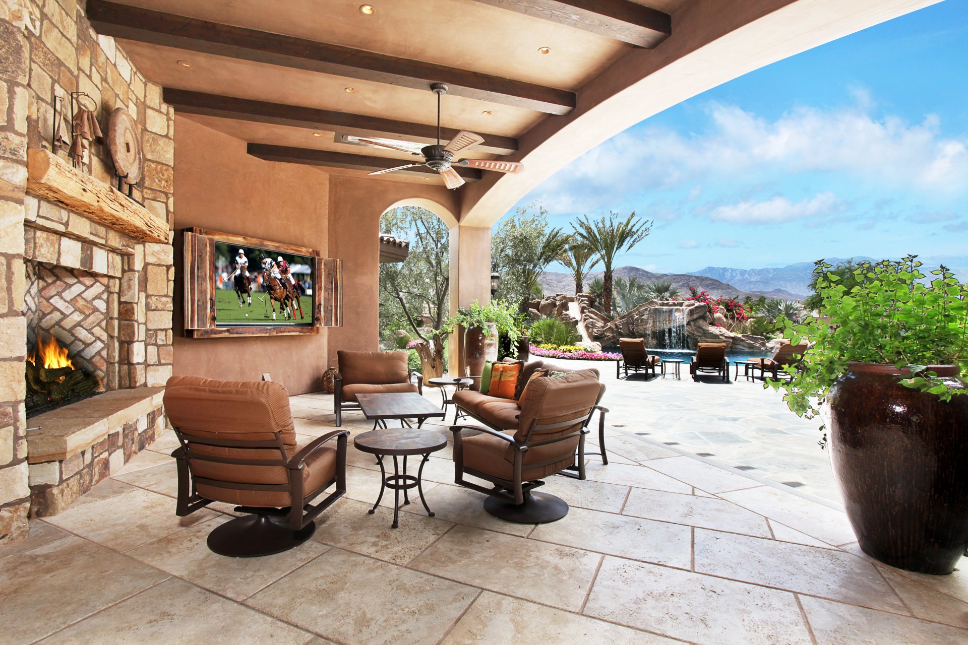 Zimmer mit Sofa und Tisch, TV und herrlichem Blick aus dem Fenster