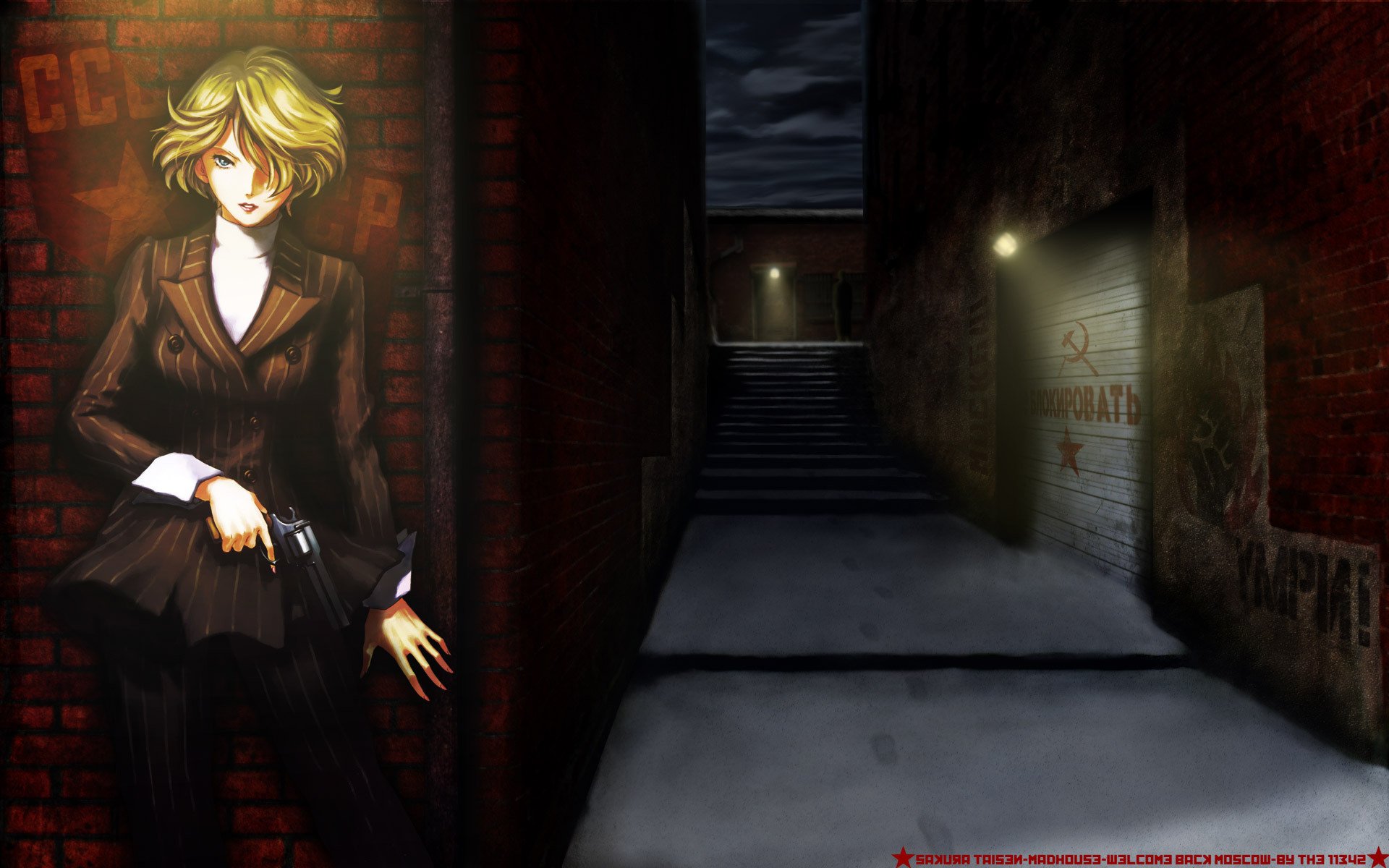 Blondine in einem Anzug mit einem Revolver in der Hand