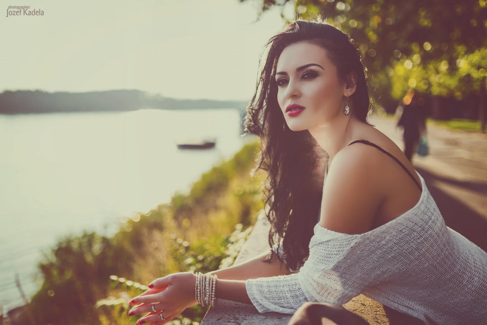 Ein mädchen in hellen jeans und mit nackten füßen kniet am wasserEin Mädchen in hellen Jeans und mit nackten Füßen kniet am Wasser