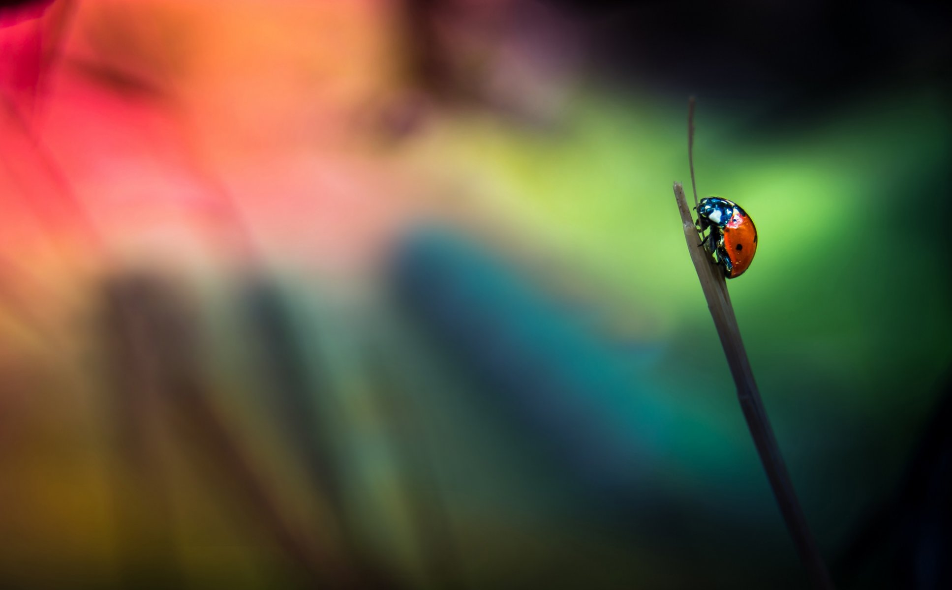 Makrofoto eines Marienkäfers am Stiel nach Regen