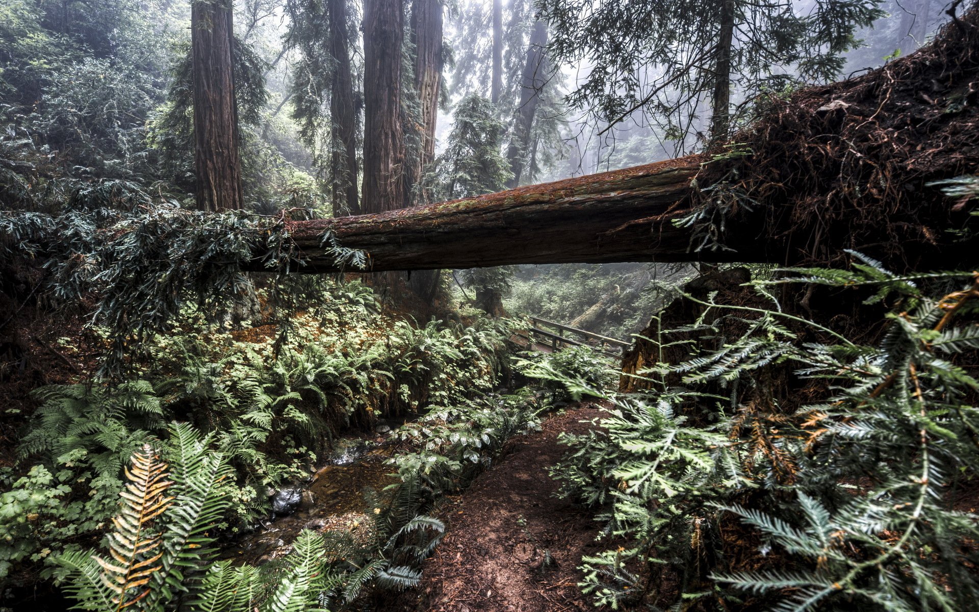 Umgestürzter Baum auf dem Hintergrund eines Wasserfalls im Wald
