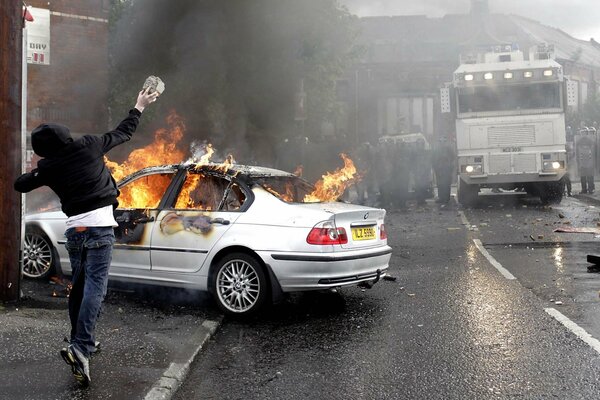 Bully wirft stein in brennendes auto