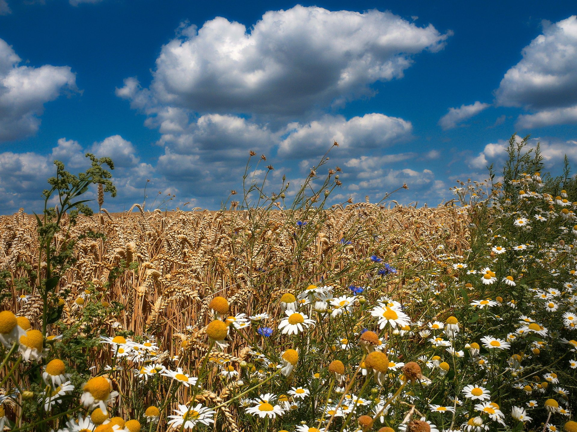 Feld in italien im sommer. schöne rosa wolken und blauer himmel im sommer in italienFeld in Italien im Sommer. Schöne rosa Wolken und blauer Himmel im Sommer in Italien