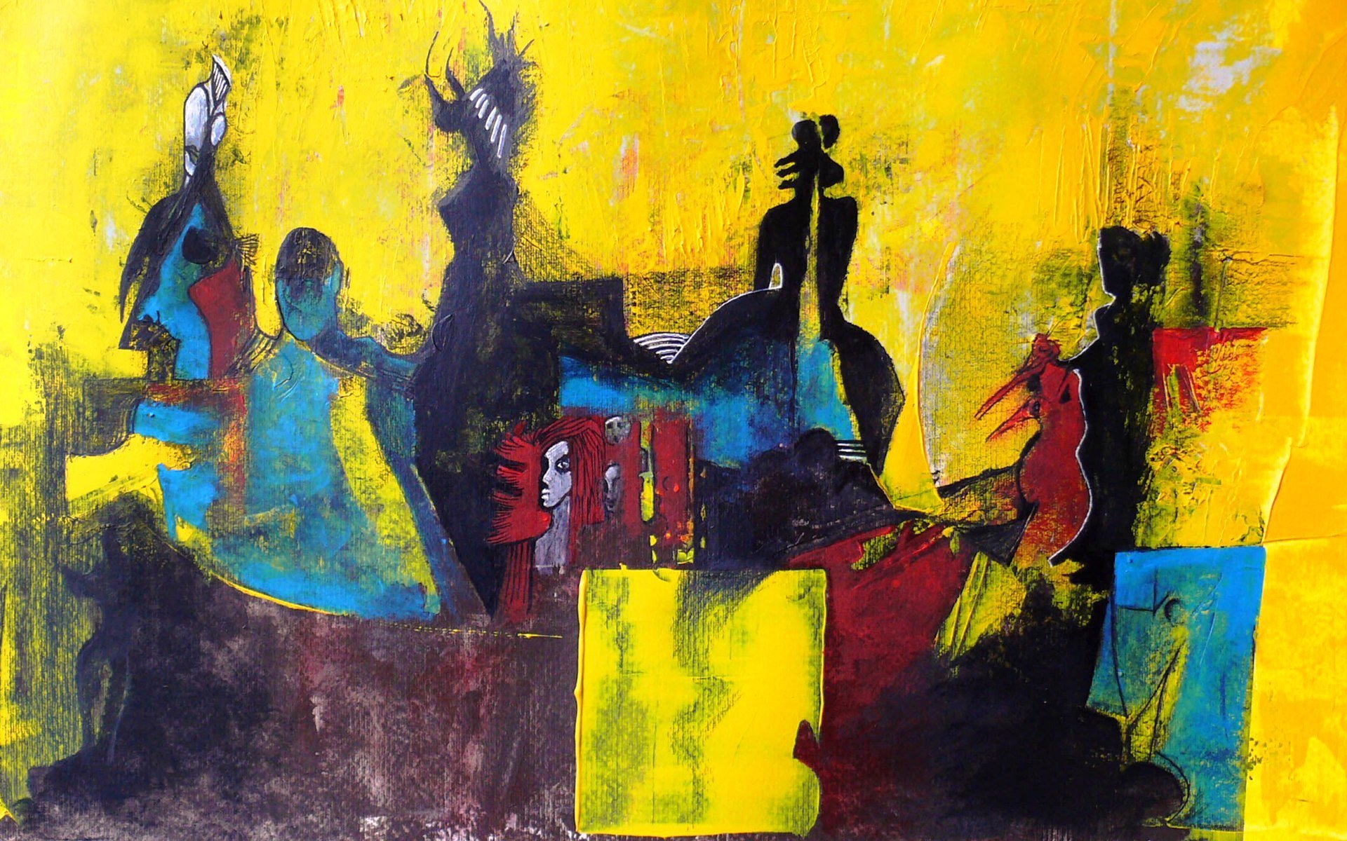 Abstraktes bild mit schwarzen silhouetten auf gelbem hintergrundAbstraktes Bild mit schwarzen Silhouetten auf gelbem Hintergrund