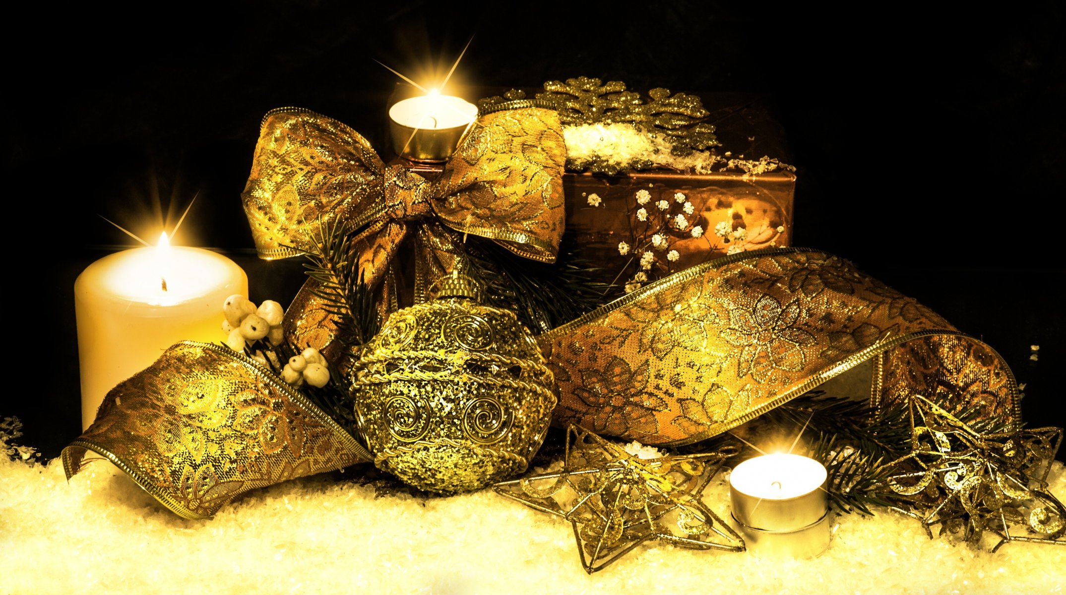 Stillleben- goldene Nüsse, vergoldete Blume und Kerze