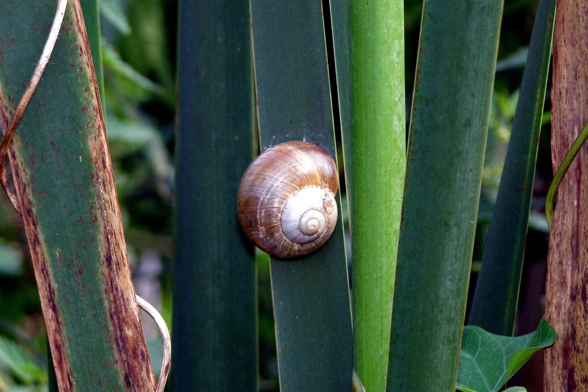 Eine Schnecke mit einer Krone kriecht durch das Gras