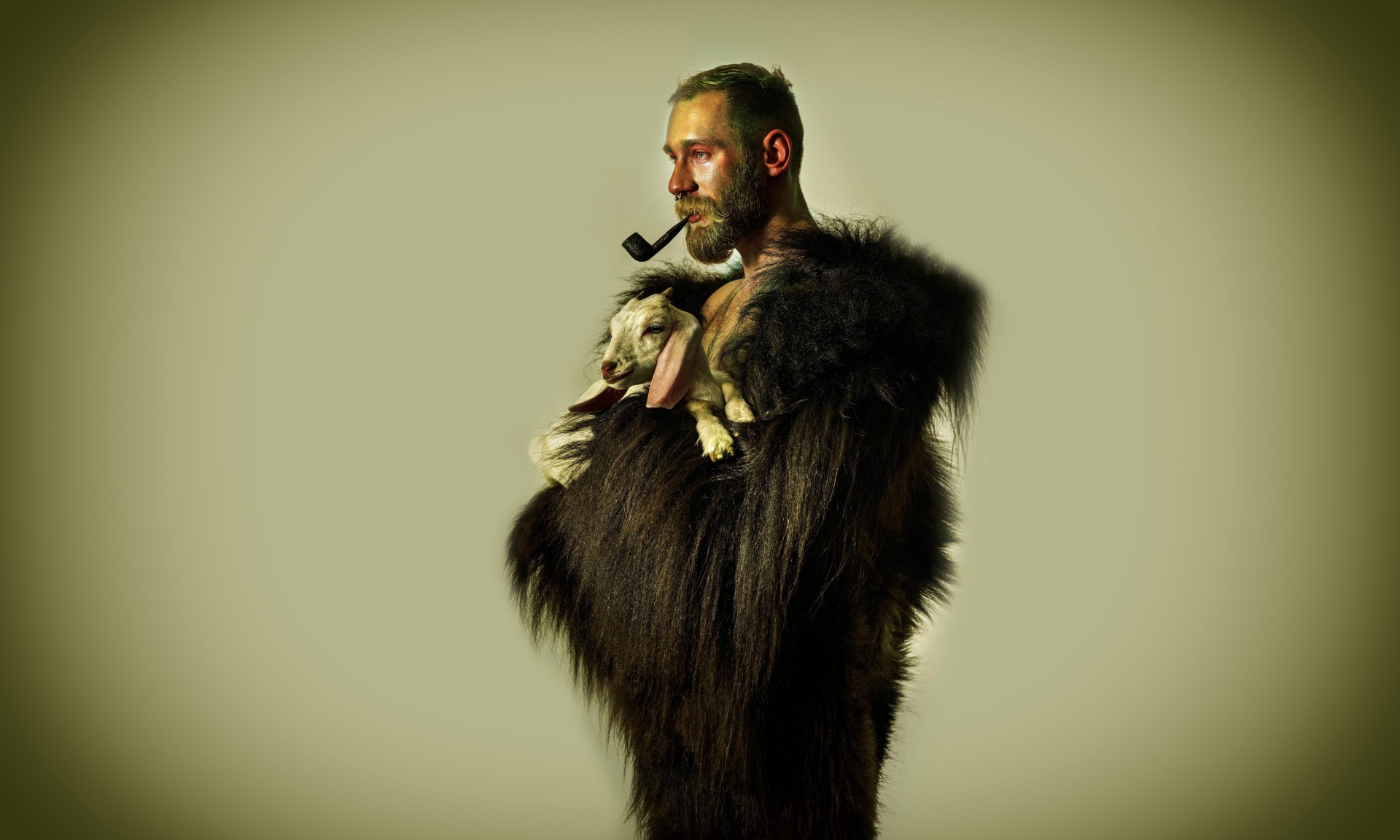 Ein Mann im Pelzmantel mit einer Tube und einem Hund