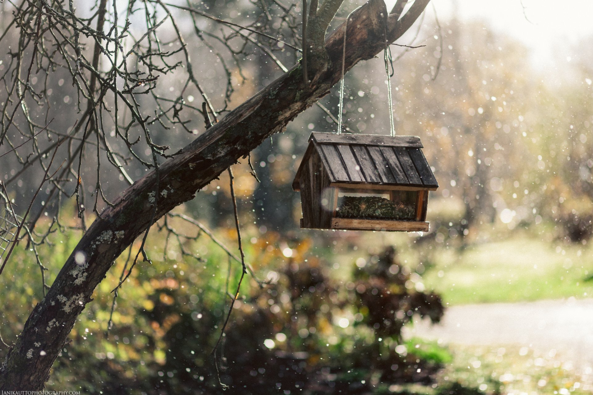 Grüner hintergrund, grüne bäume, vogelhaus am baumGrüner Hintergrund, grüne Bäume, Vogelhaus am Baum