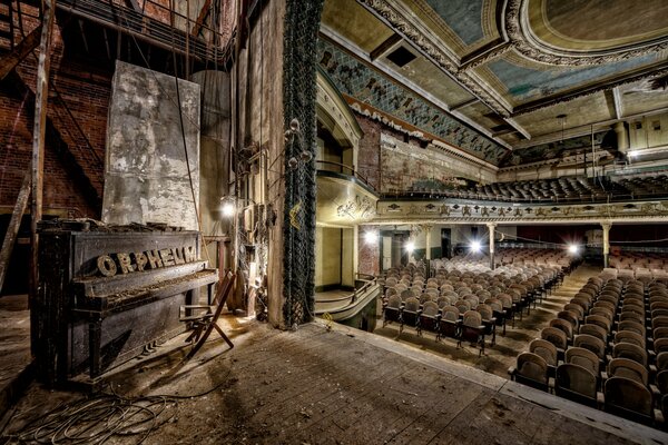 Großer alter Saal mit Klavier auf der Bühne
