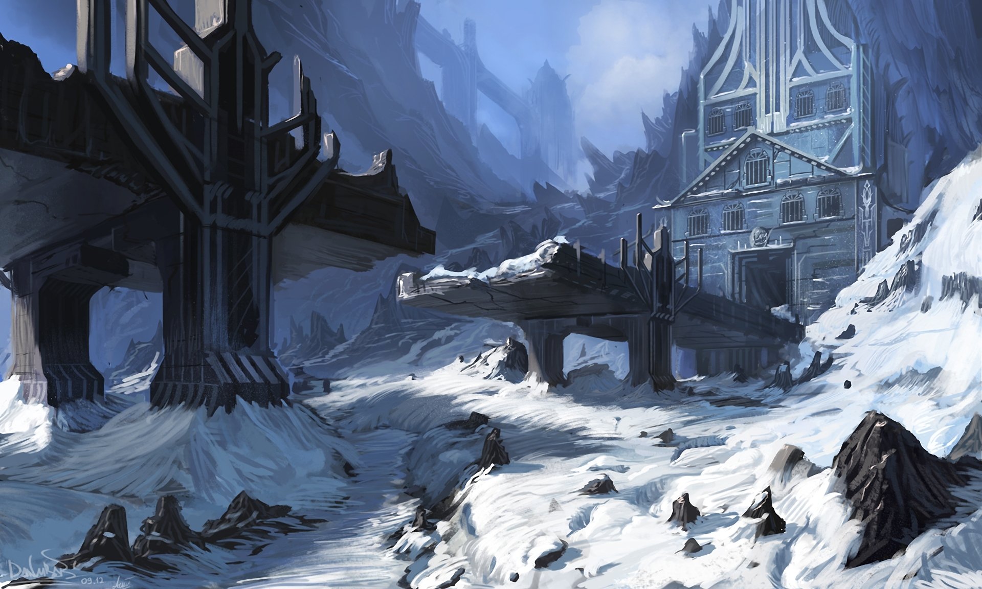 Kunstschloss mit brückenruinen, winter-vokruk mit schnee und steinen, blick vom eingangartKunstschloss mit Brückenruinen, Winter-Vokruk mit Schnee und Steinen, Blick vom Eingangart