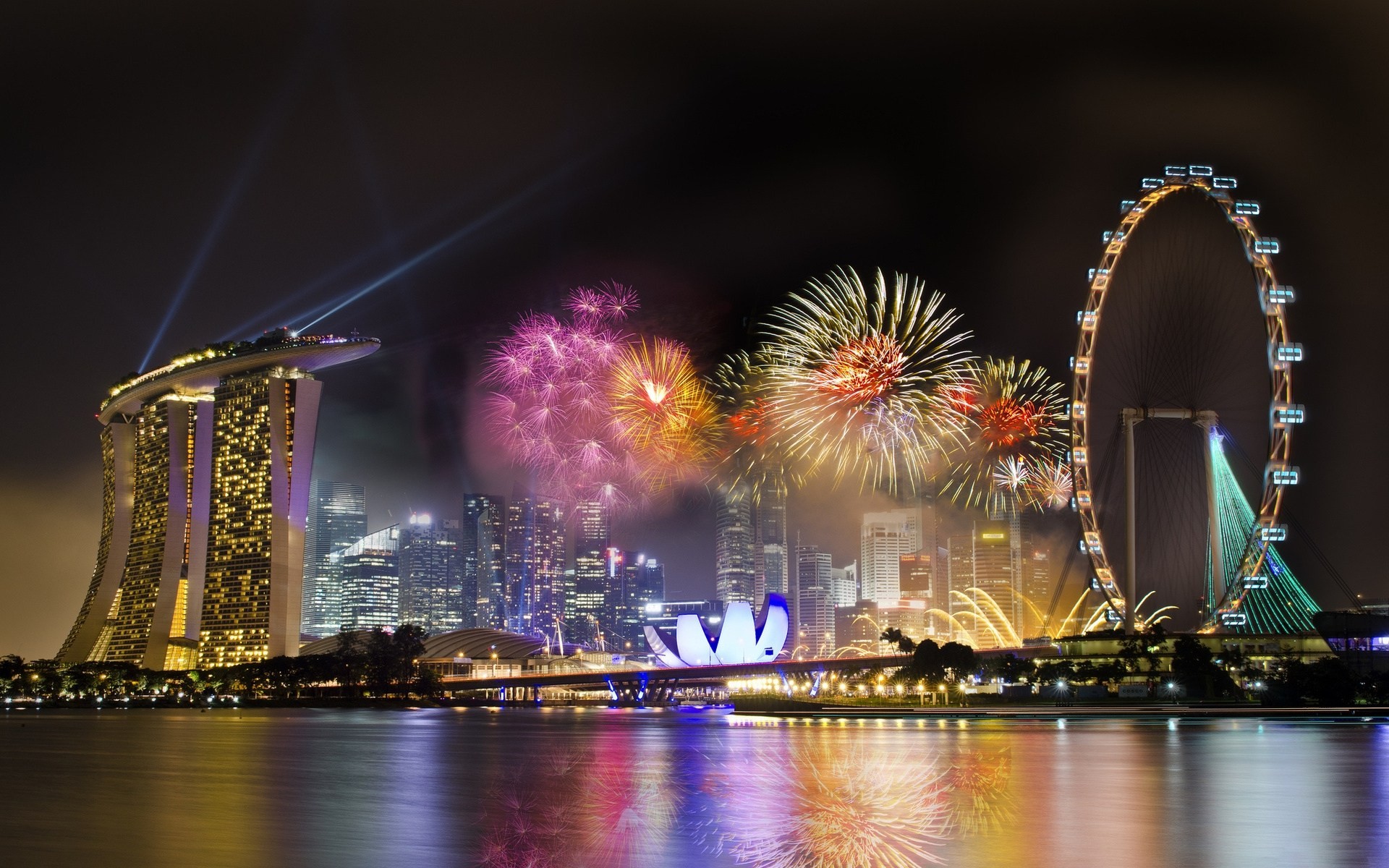 Feuerwerk auf dem Hintergrund des Riesenrades von Singapur